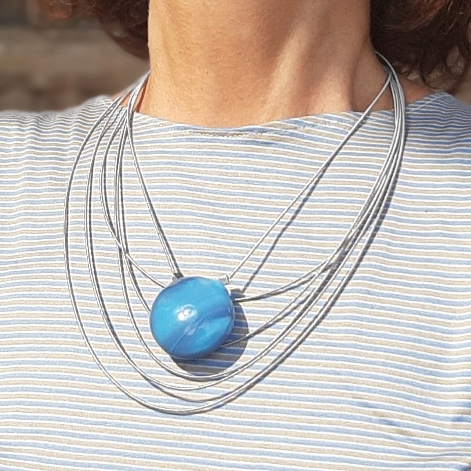 This necklace is realized with steel wires and a single Murano Glass hand-blown pendant. The bead is blown, handcrafted and hot fired in two shades achieving changing nuances.